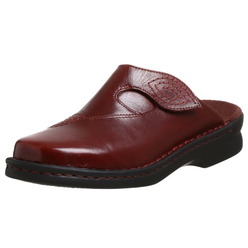 Keep your classy style in the Alana clog from Clarks. Its smooth leather upper is accented by its simple rounded toe and topstitched vamp with leaf design across it. The top leaf Velcros shut to provide a better fit, and its molded insole will give you all the comfort that you need to get around in style.