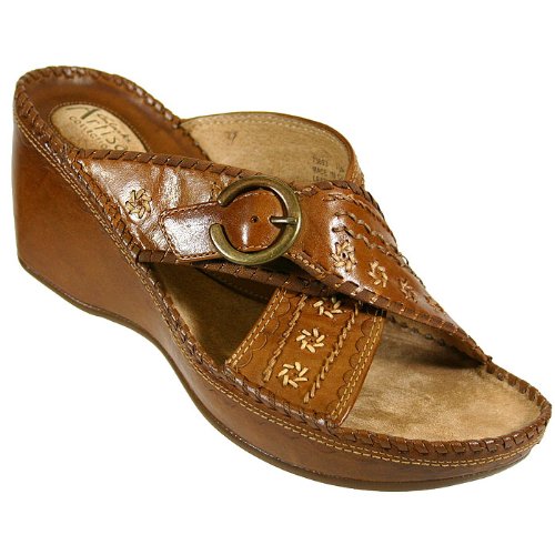This pretty cross strap sandal boasts an artisan look and terrific comfort features. Broad supple leather straps are detailed with decorative stitching and an antiqued metal C logo buckle. The cushioned suede and leather footbed has a comfortable cradle design and whipstitch trim for added style. Pretty scalloped edge trim details the covered platform midsole, which rises gently to a very wearable 2 1/2 inch heel. Sport this stylish sandal with everything from jeans and capris to breezy skirts.